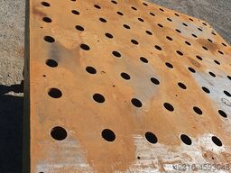 Děrovaný plech Výrobce neznámý Rozměry 1500x1500mm Pracovní výška 940mm --výška nastavitelná-- Nožky šroubované Tloušťka desky 110mm Otvor 45mm Hmotnost cca. 2,0 tuny